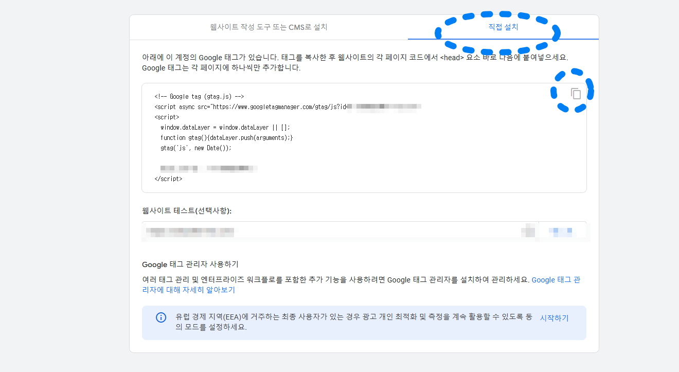 그러면 화면이 나오는데 우측 상단에서 직접 설치를 누르면 밑에 코드가 나오게 되고 우측에 네모가 두 개 있는 버튼을 누르면 코드가 복사가 됩니다. 이제 여기서 스킨편집을 하면 됩니다. 자 이제 거의 다 왔습니다.