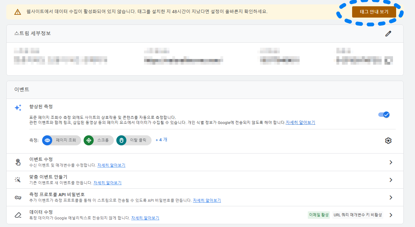 그러면 이렇게 스트림 세부정보가 나오게 되고 우측 상단에 태그 안내보기를 클릭합니다.