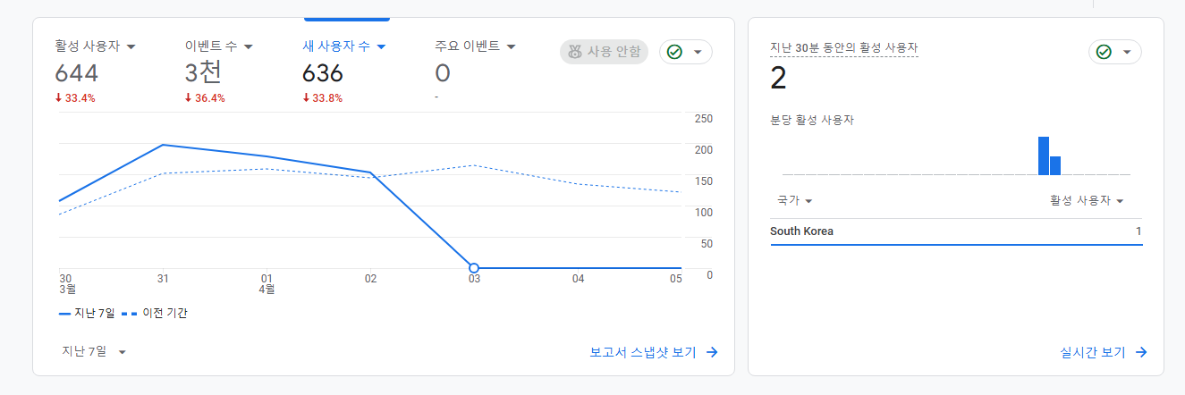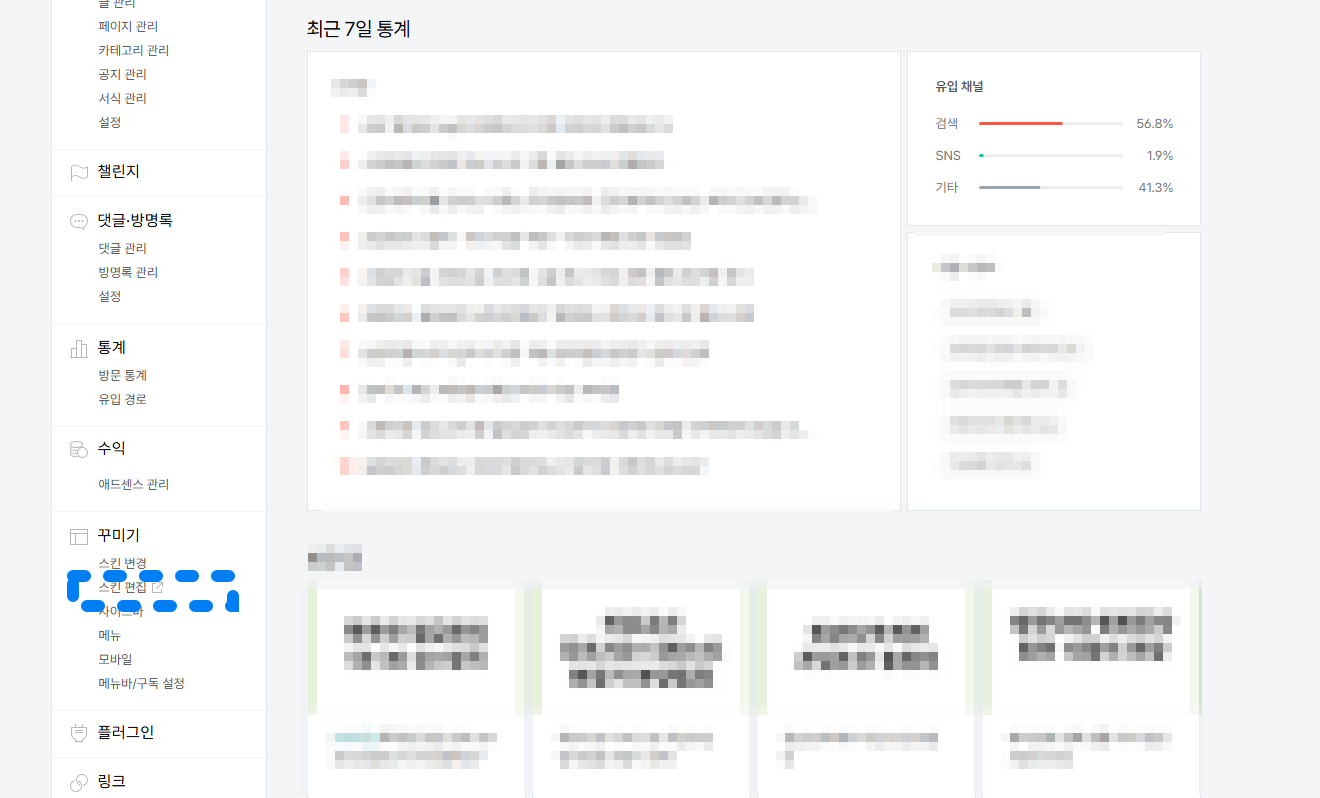 이제 막 복구를 했기에 최근에 2명이 방문하신 것이 보이는데요. 3일전부터 스킨 변경 후에 갑자기 0명이 된 걸 보실 수 있습니다. 아마도 다들 이런 상황에서 당황을 하셨을 텐데요. 그러면 다음 스텝으로 가볼까요?