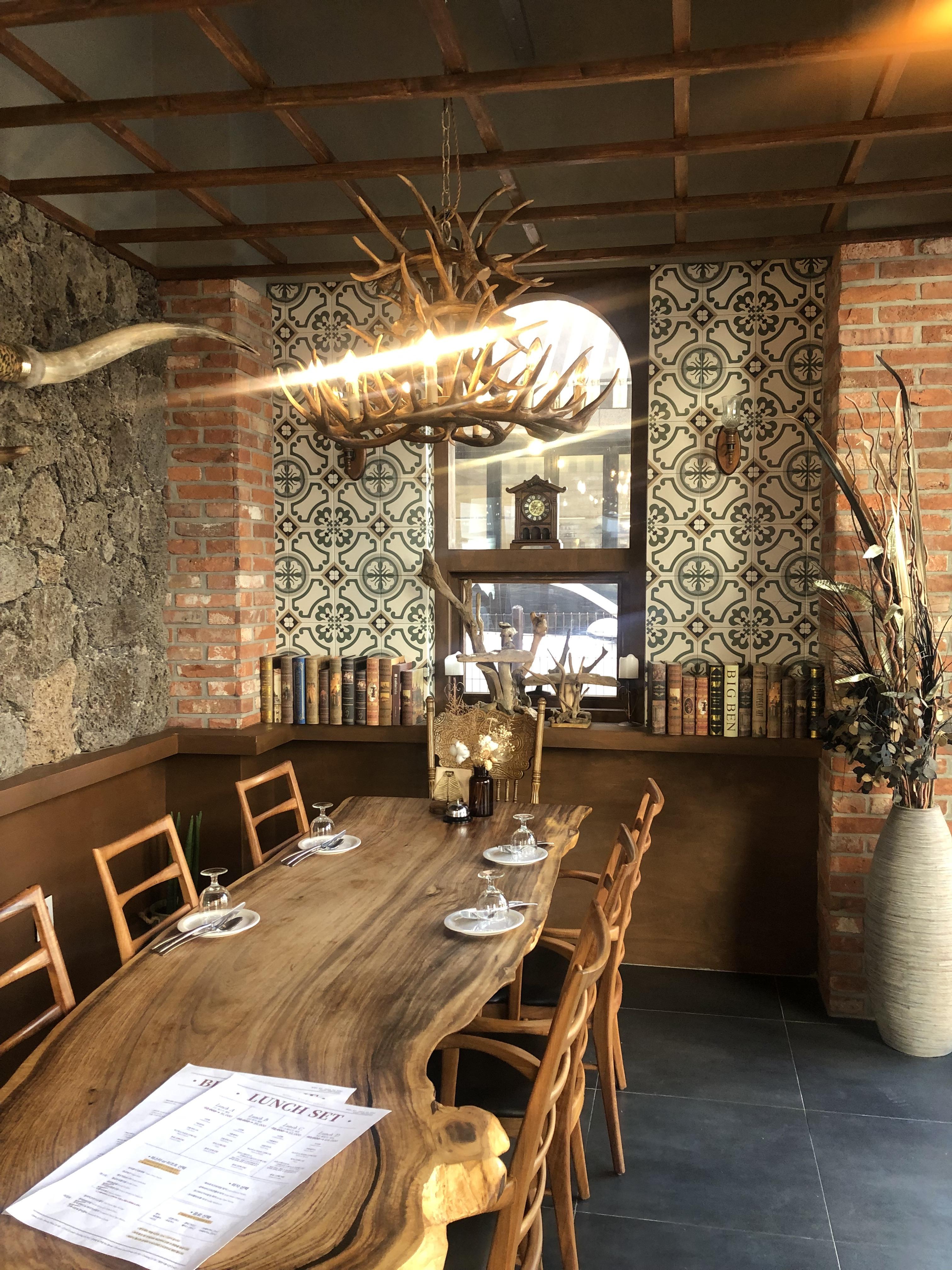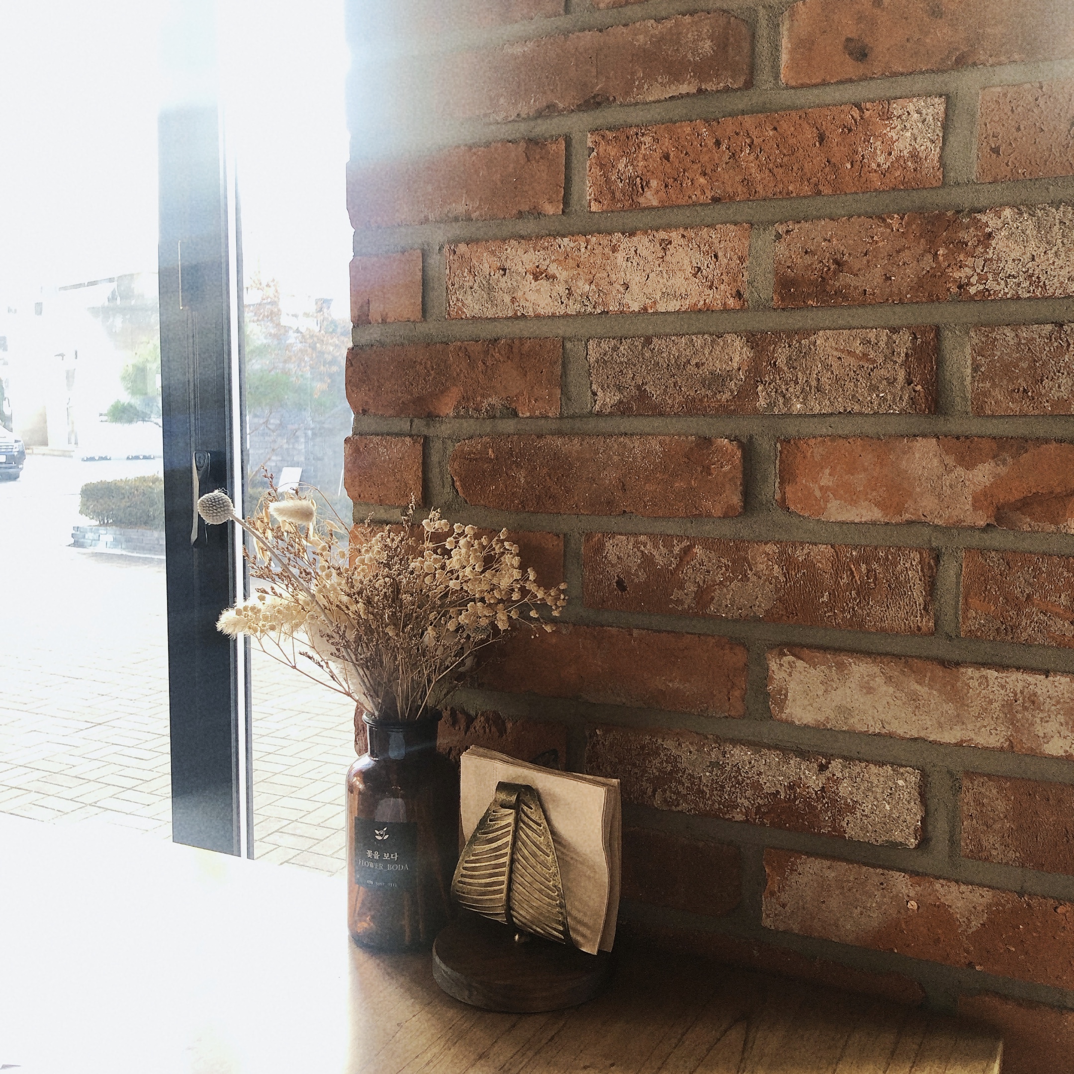 빨간 벽돌과 나무로 이루어진 인테리어가 따뜻한 느낌을 주고 있어요.