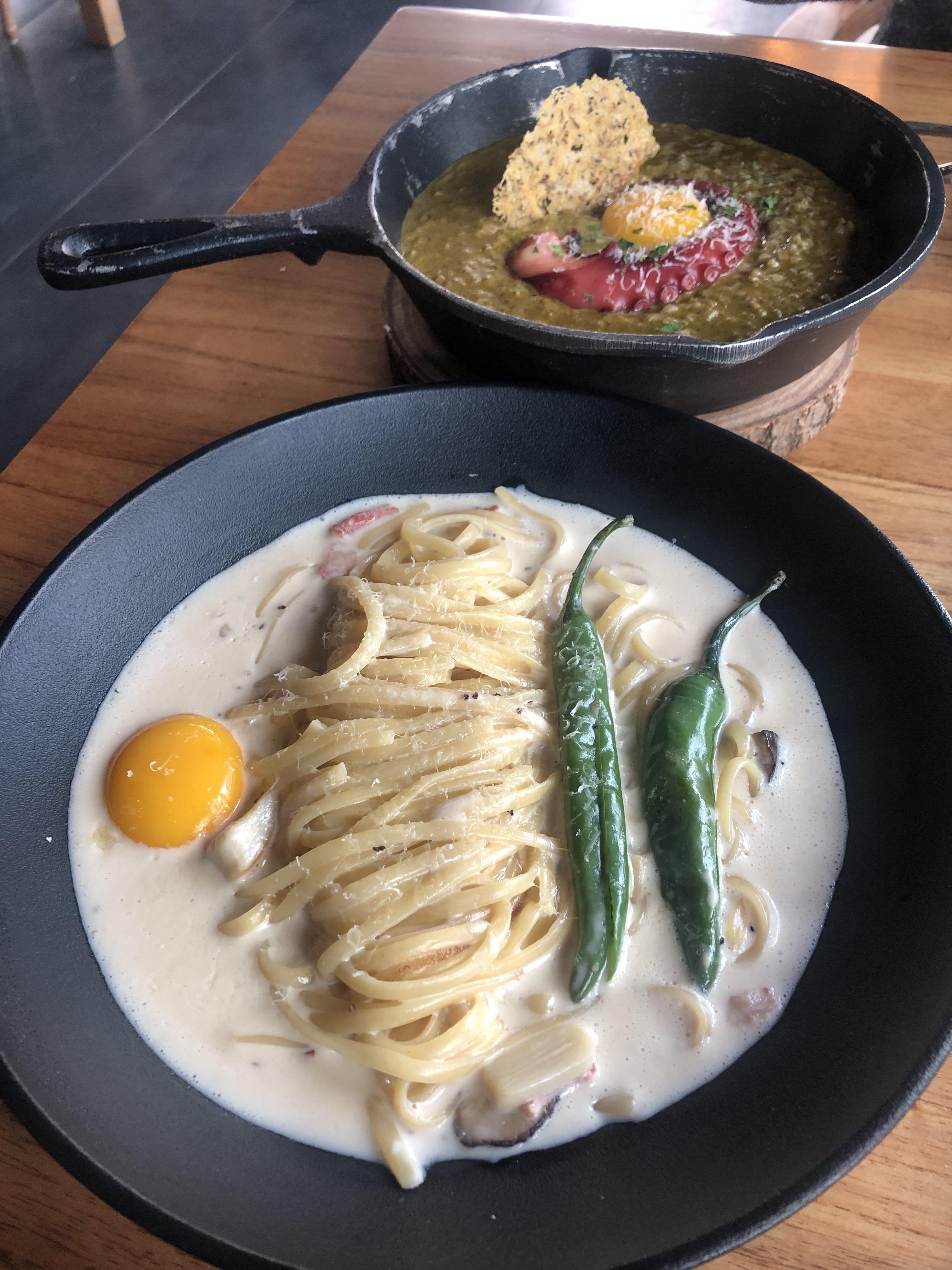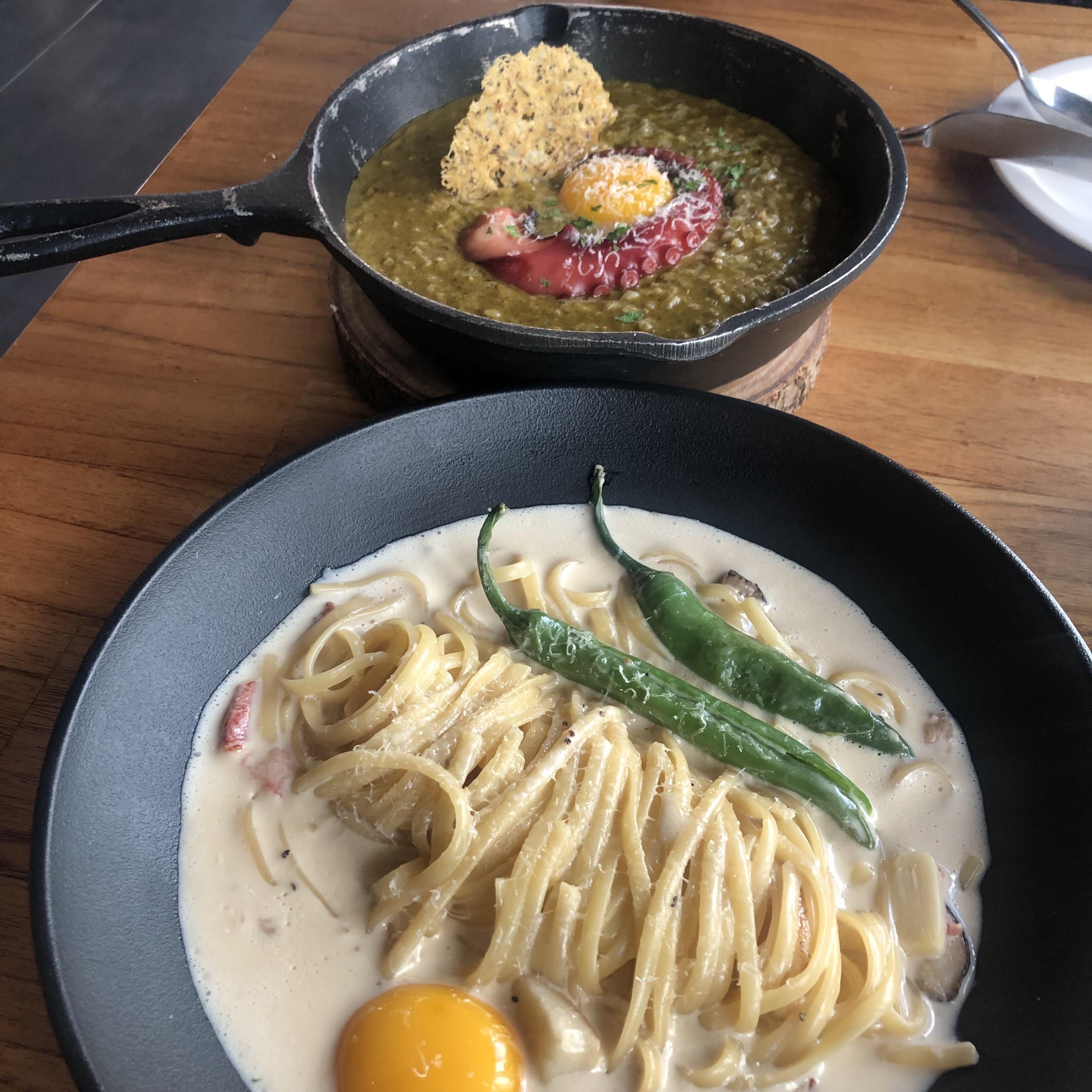 저희가 주문한 땡초까르보나라와 전복내장&문어콩피 리소토가 나왔습니다.