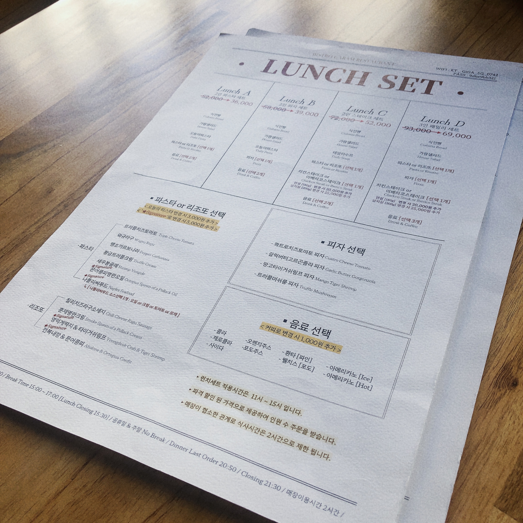 - 파스타나 리조또 선택에 따라 추가금이 발생할 수 있습니다